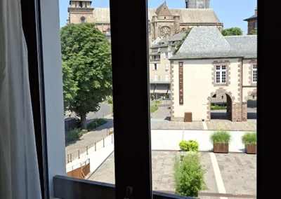 Ces suites très spacieuses (25 m2) sont éclairées par deux double portes fenêtre qui s’ouvrent sur la Cathédrale de Rodez et possèdent une superbe vue sur le centre historique.