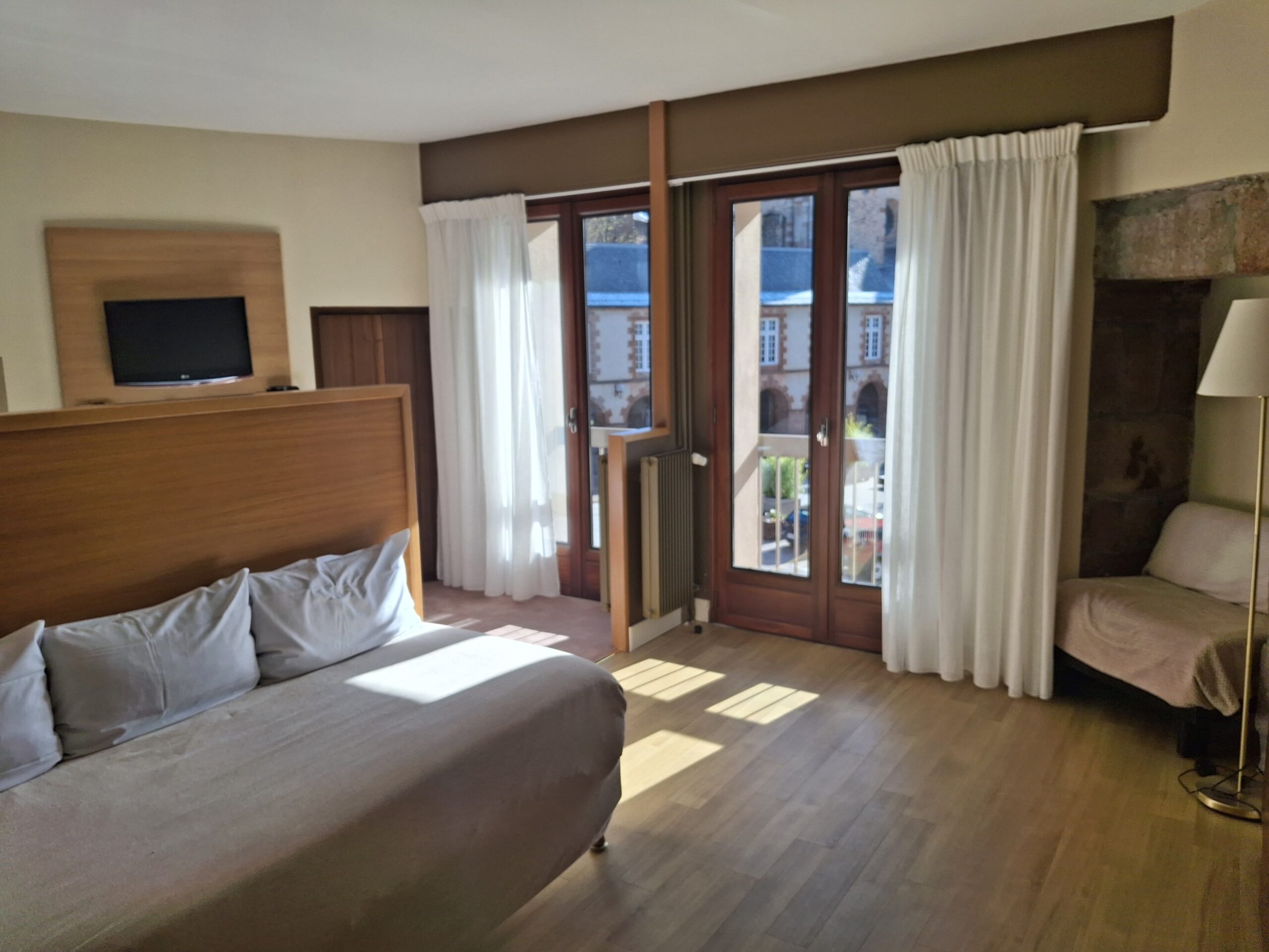Décoration résolument moderne pour une architecture médiévale, les Suites situées dans l’enceinte même de La Tour vous accueillent en famille ou en couple. Elles sont vastes, environ 30 m2 et sont éclairées par une double porte fenêtre qui s’ouvre sur la Cathédrale de Rodez et la Chapelle Royale, elles possèdent une très jolie vue depuis leur balcon.
